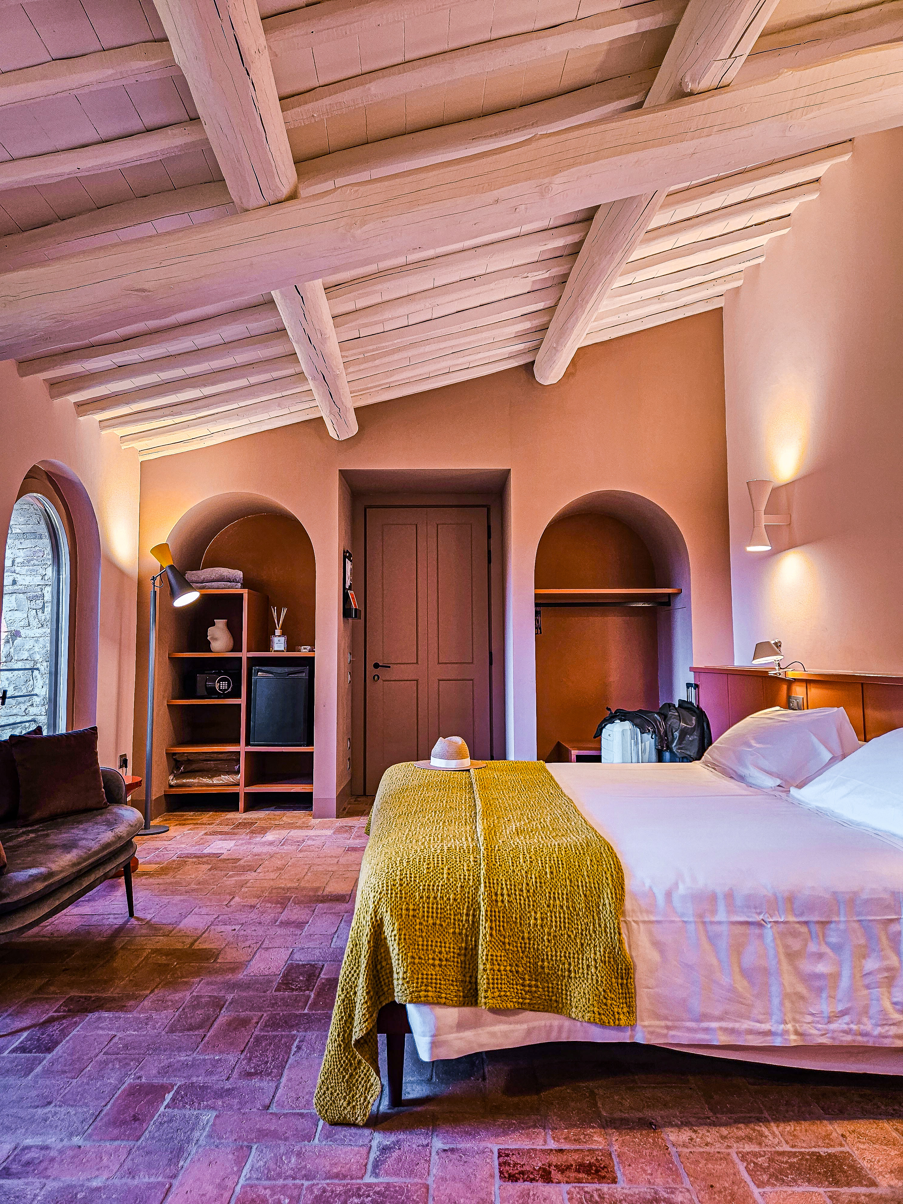 Inside, rooms balance modern comfort with medieval character, exposed beams, pops of turquoise, and hand-selected artwork paying homage to the region. Step onto the terrace to watch the sun spill across forested hills and terraced vineyards, or linger over a local wine tasting as the light softens. At La Sosta, every detail, from curated excursions to locally sourced meals, feels designed to slow you down and connect you with the land, the culture, and its people.