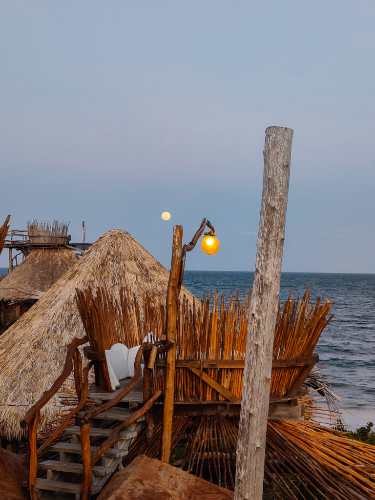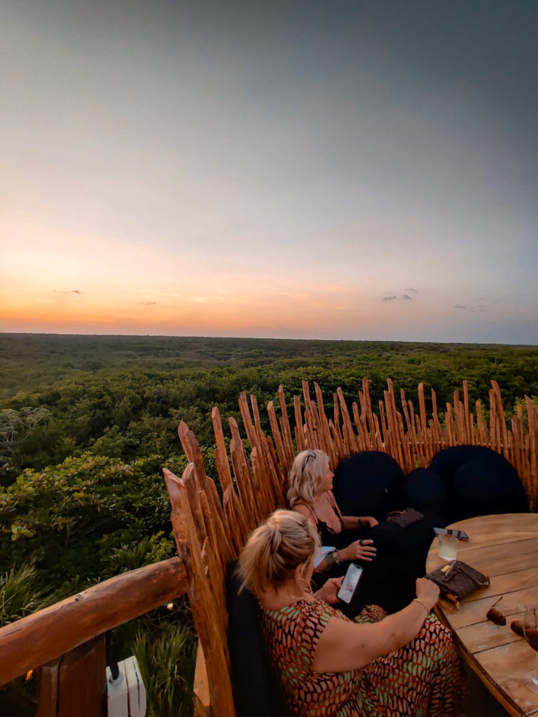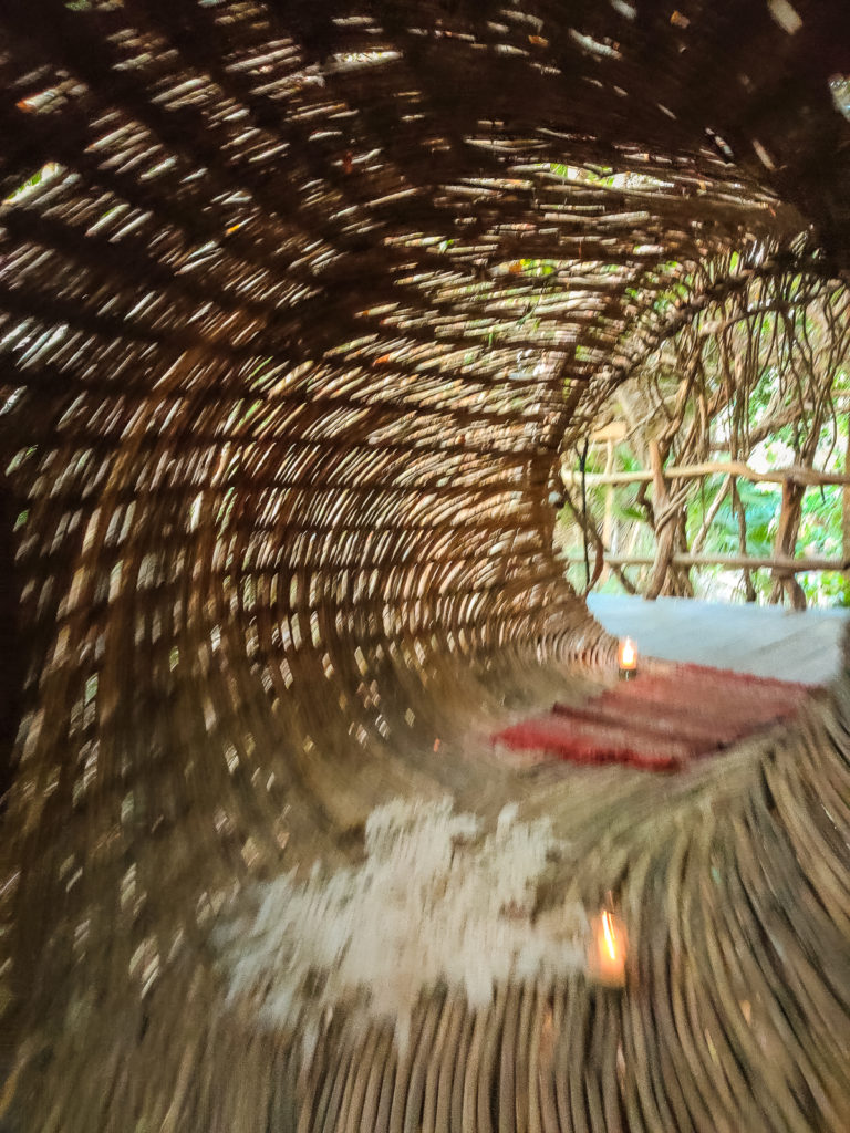 Our butts were in pieces because of the bikes and we needed a break before we biked back to our hotel. We used that as an excuse to stop for a drink. Just like the wooden female torso sculpture, the line to get into Azulik–a famous Tulum hotel, restaurant and art gallery–is very long. In fact, you can’t get in without a reservation so make one at least a month in advance before you go–even if it’s just for drinks. Azulik and it’s restaurants in Tulum are a touristy stop, but worth stopping by because it is so unique to Tulum. The experience begins by walking into a large woven wooden tunnel that takes you up into a floating treehouse. The guests who stay at the property move around via suspended jungle gyms (if you don't believe me...see my video in the below post to see what I'm talking about). But their primary attraction are their birds nest for private dining, located on the top of their hotel overlooking Tulum beach on one side and the jungle on the other.