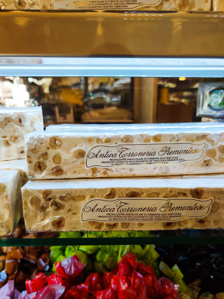 I had checked truffles off my list, but now it was time to bite into the sweet stuff from Alba, their traditional dolci. Alba is home to the nougat or Torrone and legendary Gianduia chocolates. We stepped inside and found ourselves immersed in an authentic Piedmont atmosphere dipped in antique wooden and velvet furniture. Their classic dolce is the bite-sized Torrone with hazelnuts from the Langhe region pictured on the upper right. You can choose from two types of Torrone the classic crumbly Torrone or newer soft Torrone. Of course, I went for the classic crumbly. The "King of Torrone d'Alba," the Antica Torroneria Piemontese produces the torroni at Bar Pasticceria Cignetti.