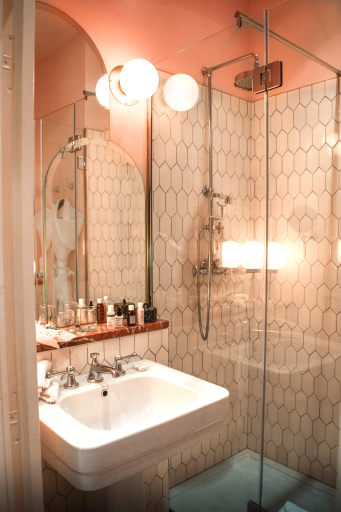 I sat on the driftwood stool at the vanity and made a call on the vintage landline phone to the reception downstairs. I wanted to make a reservation for dinner and breakfast in room the morning after. While waiting for someone to answer, I glanced at the reddish brown marble and accessories on the vanity. An in-room Nespresso machine was available as well as an old school Grand Boulevards hotel pencil and notepad. A small book holder on the side had pamphlets about the city as well as a cocktail book and information about the hotel. After scheduling our reservations, we made our way down the stairs to The Shell bar for cocktails, the Grands Boulevards restaurant for dinner, and the hotel's rooftop bar The Shed for post-dinner drinks.