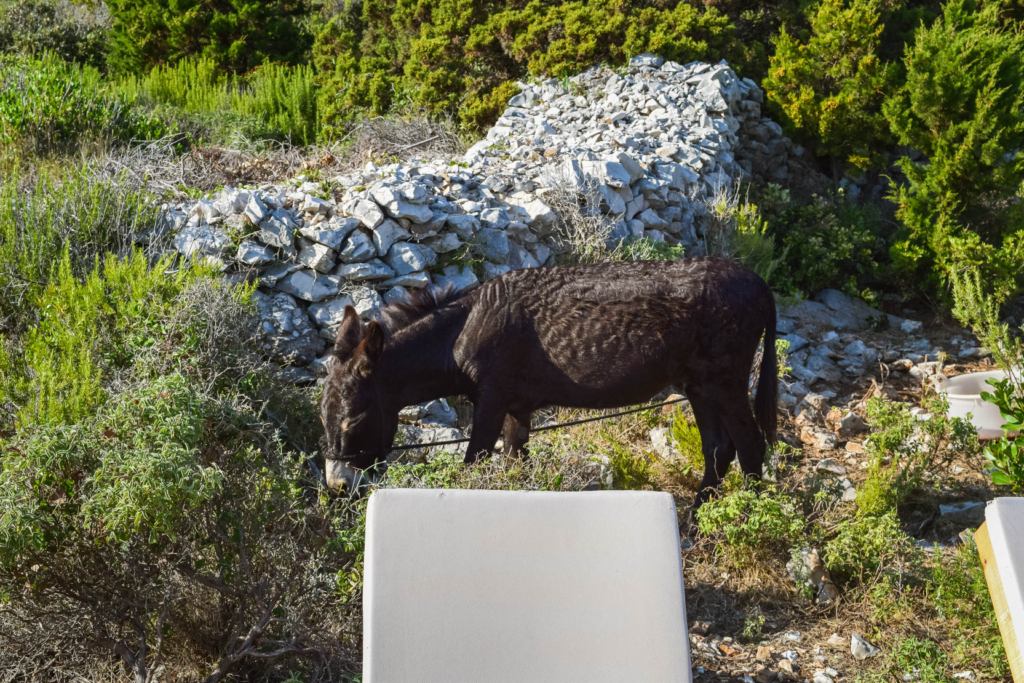 A colorful character approached up. He was dressed to impress with necklaces abound and impeccable makeup, he walked over to greet us at the entrance as he sang along to the Mariah Carey soundtrack playing in the background. He asked if we wanted a drink (Pina Coladas anyone?) and to rent a day bed to watch the sunset over the Adriatic Sea. We were so caught off guard by the beauty of this place, we were highly debating it. There was no one else in sight except for one other couple who had made it to this place! We had a decision to make--hike Robinson trail or stop for drinks in this marvelous, secluded beach bar and call it a day. We were on a mission, so passed on the drinks. As we left I caught a dark shadow out the corner of my eye. That's when I realized a donkey was just casually grazing at the grass near the entrance of Pacha Mama Beach Bar. So Hvar!