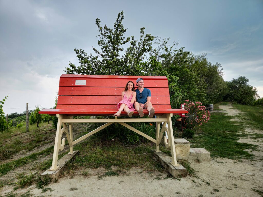We followed the winding roads in search of the Big Benches—massive, colorful installations tucked into the rolling landscape. Started by American designer Chris Bangle in 2010, these oversized benches were meant to make visitors feel like kids again, feet dangling, hearts wide open, soaking in the vastness of the Langhe. The project has grown into a community initiative, supporting local artisans and tourism through handcrafted products and donation-funded installations. Anyone can sponsor one—or even build their own.