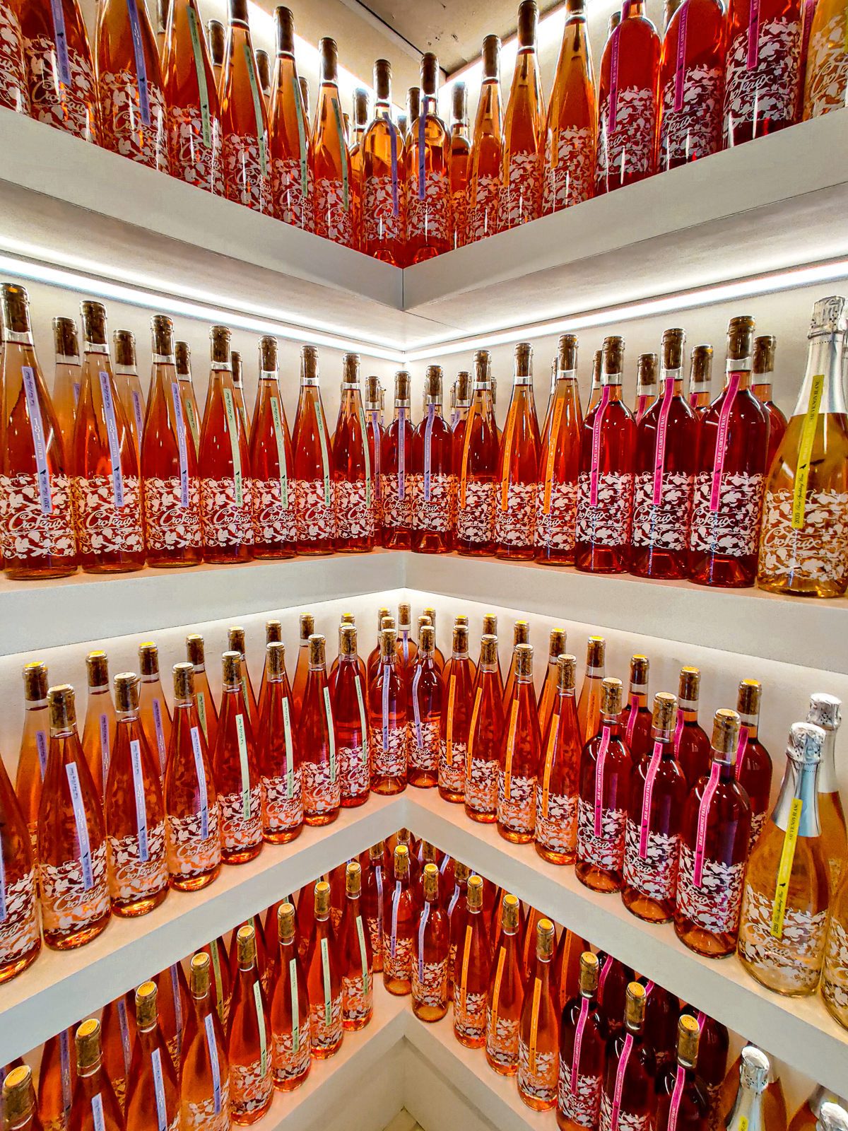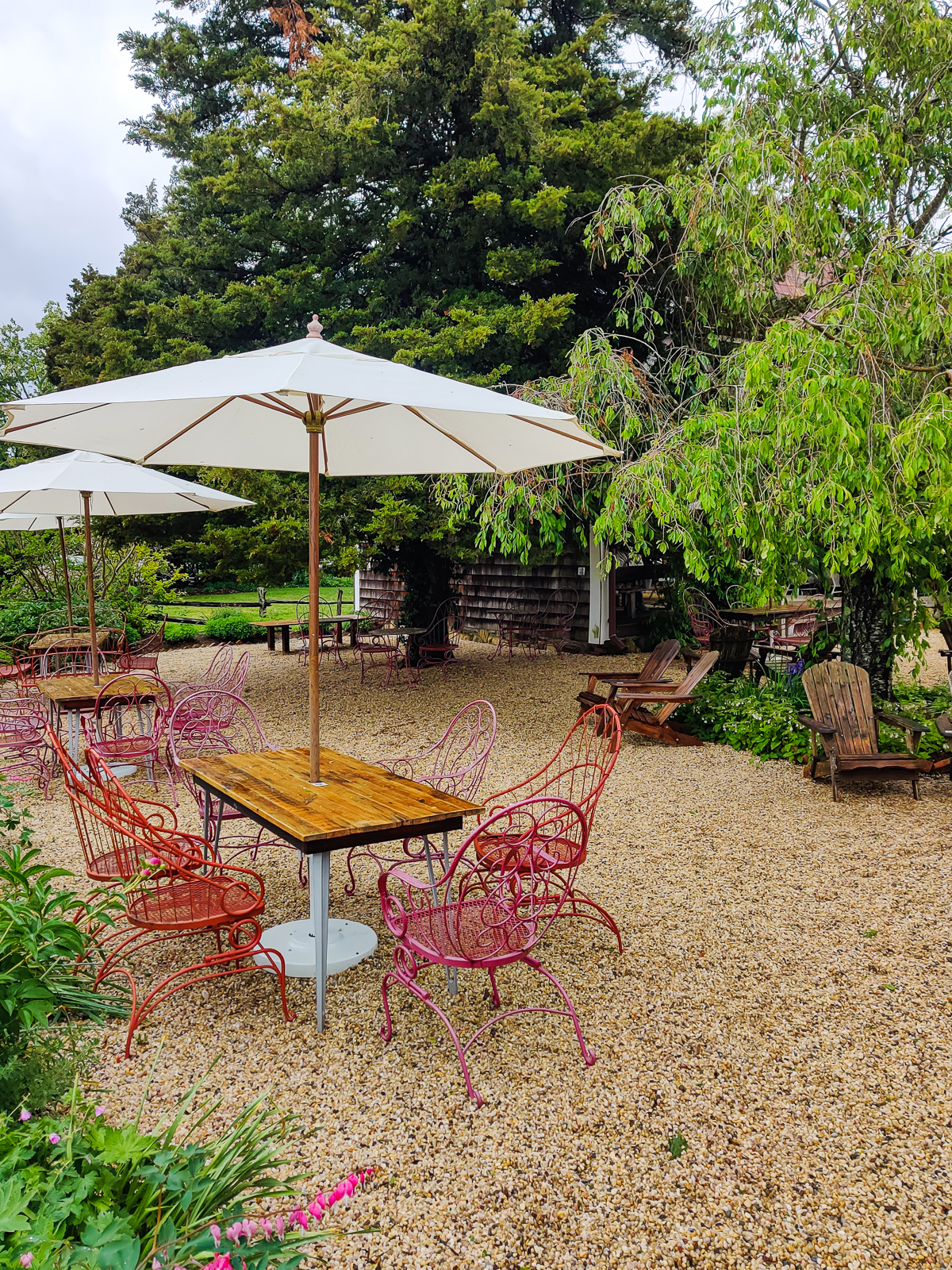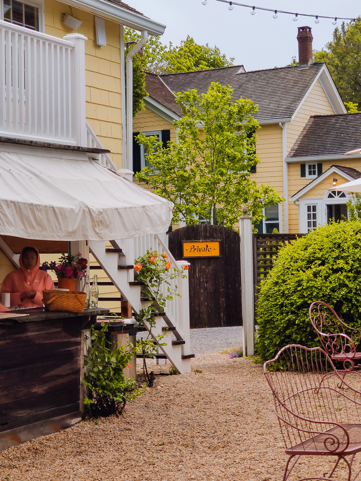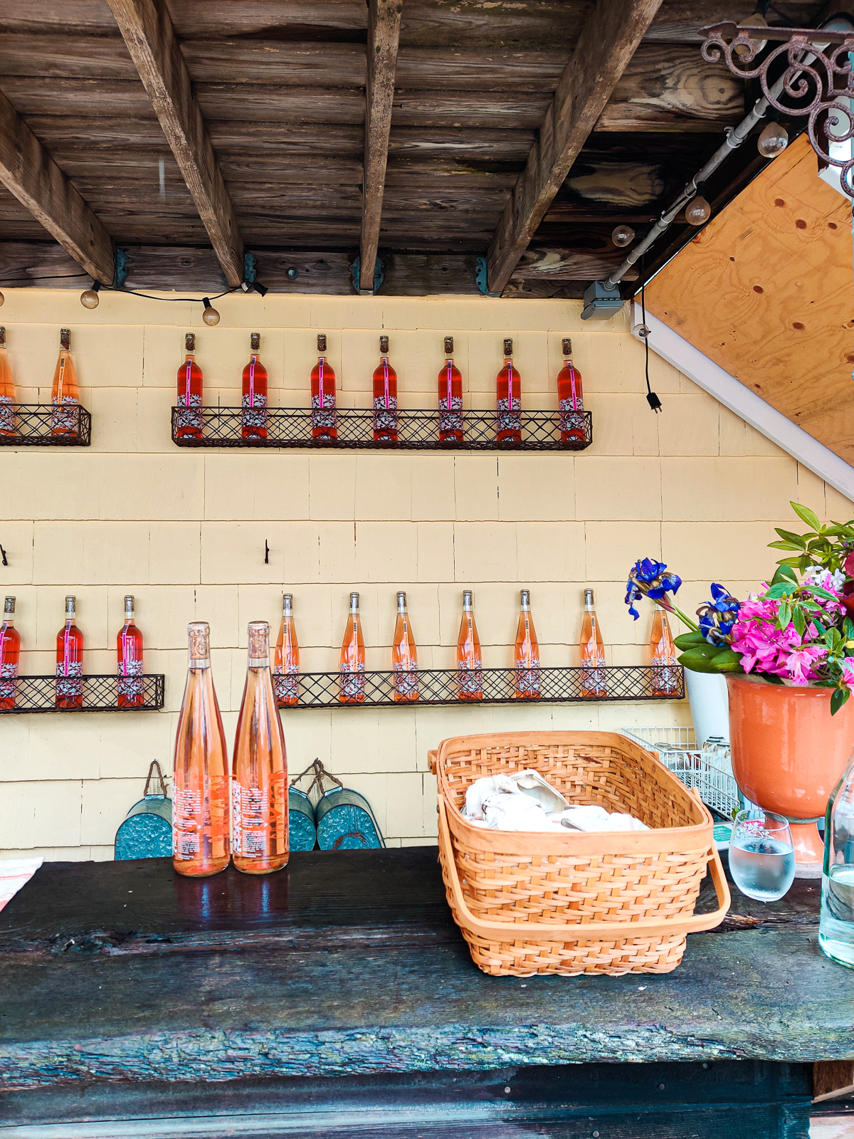 Across from us, were more rooms hidden inside the old shingle house. A wall in the back was lined with empty rosé bottles hanging from a string and the outdoor bar had colorful rosés hanging on the wall. On a beautiful day you could choose to drink at any of the outdoor tables out on the vineyard or bring your own picnic blanket and food and find a nice spot out on the grass. Needless to say, it's a millennials dream scene. After all, the winery is coated in millennial pink colors!