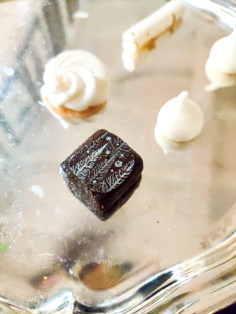 Let's be clear, I never pass on dessert. The night before I had eyed a soufflé and dreamed about it ever since. My conversation with Sonia, Director of Maisons & Hotels Sibuet, about the soufflé persuaded me even further. The waiter punched down the St. Tropez-style lemon soufflé with fruit and sorbet like an artist, then stepped back with a flourish to add the final touch, a scoop of sorbet dropped right in the middle of the soufflé. This is the real French way to eat soufflé. Pat and I watched as our soufflé deflated with equally deflated expressions. The sorbet started melting once it hit the warm depths of the soufflé and our eyes and insides lit up. Accompanying the lemon soufflé was a silver platter of small bite-sized desserts and chocolates. We took a bite of a pine-flavored chocolate that exploded with the taste of Christmas spirit.