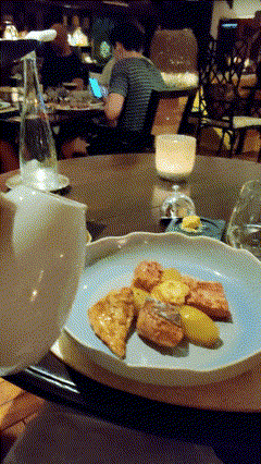 Patrick indulged in the sea bass fillet with herbs and vegetables made in Provençal style. Provençal style just means that the cuisine, like much of the Mediterranean cuisine, is simple. It's focused on preserving the taste and texture of the seasonal ingredients, in this case the vegetables, wild herbs, and fish. The Provençal style vegetables are sliced and layered on the bottom creating a rainbow of colors, reminiscent of a ratatouille. The vegetables are majestically topped by a slab of grilled sea bass. The sea bass was well seasoned with herbs and grilled to perfection. The dish was finely prepared, full of flavor, and elegantly presented.