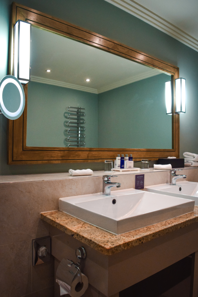 The suite was massive with windows on either side of the TV offering splendid views across Lough Atalia, a shallow lake in Galway city. Unfortunately, it was after 5PM in December and it was dark outside so we weren't able to enjoy the view. The bedroom was fixed with all the necessities two enormous wardrobes, a personal in-room heater, a king size bed, a couch, a desk, complimentary and private in-room wi-fi, a sitting area with a couch, complimentary water and a TV. The bed was beyond comfortable. It was decked with Egyptian cotton linens with oversized 70% goose down and hypo-allergenic duvets and pillows. It was by far one of the most comfortable beds we slept in during our time in Ireland.