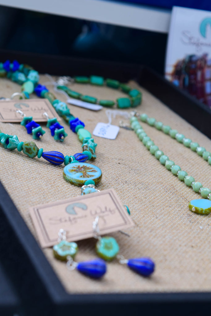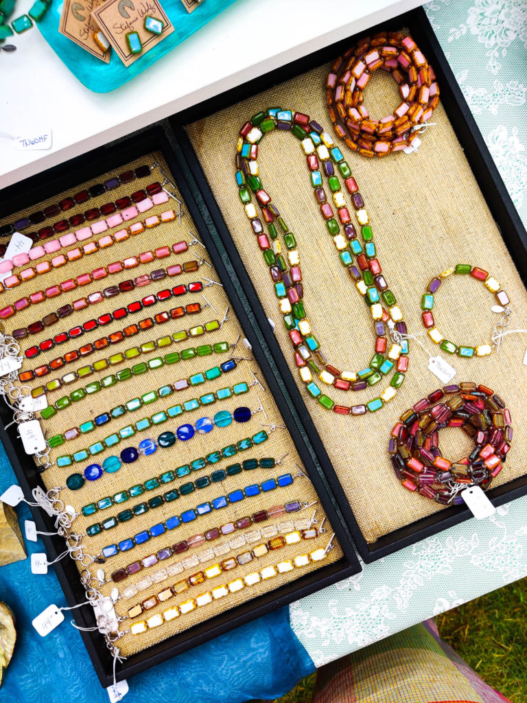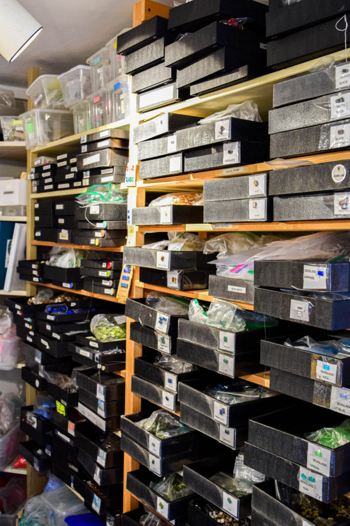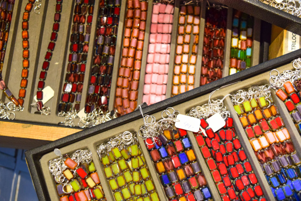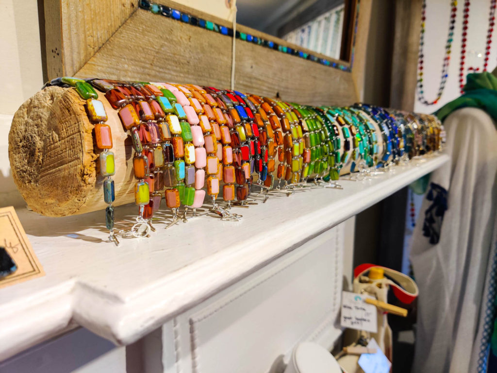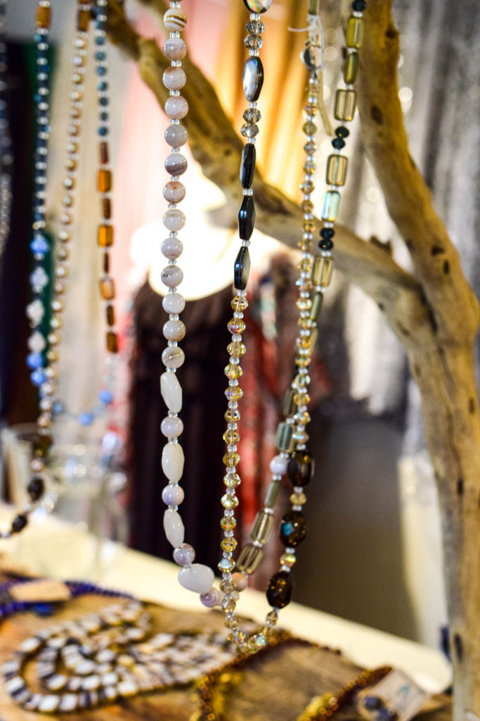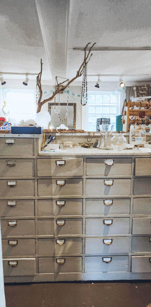 Her jewelry is made possible thanks to her large collection of beads and the inspiration she finds designing jewelry among the many pieces in her store and studio. When she touches and feels the product, each piece of glass is unique and has its own personality, it tells her what it wants to become. Her store features a tall, white apothecary table containing thousands of glass beads. Not only does she sell her jewelry, but she teaches jewelry-making classes as well and does private DIY create and sip classes (sign me up!), where she enjoys sharing the knowledge she has gained over the many years she has been making jewelry.