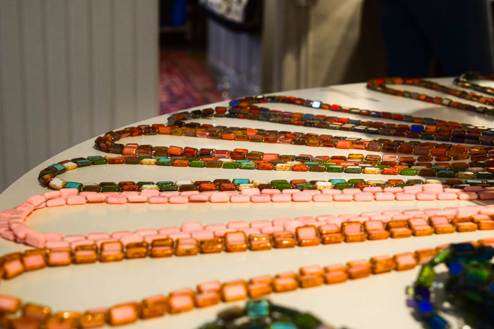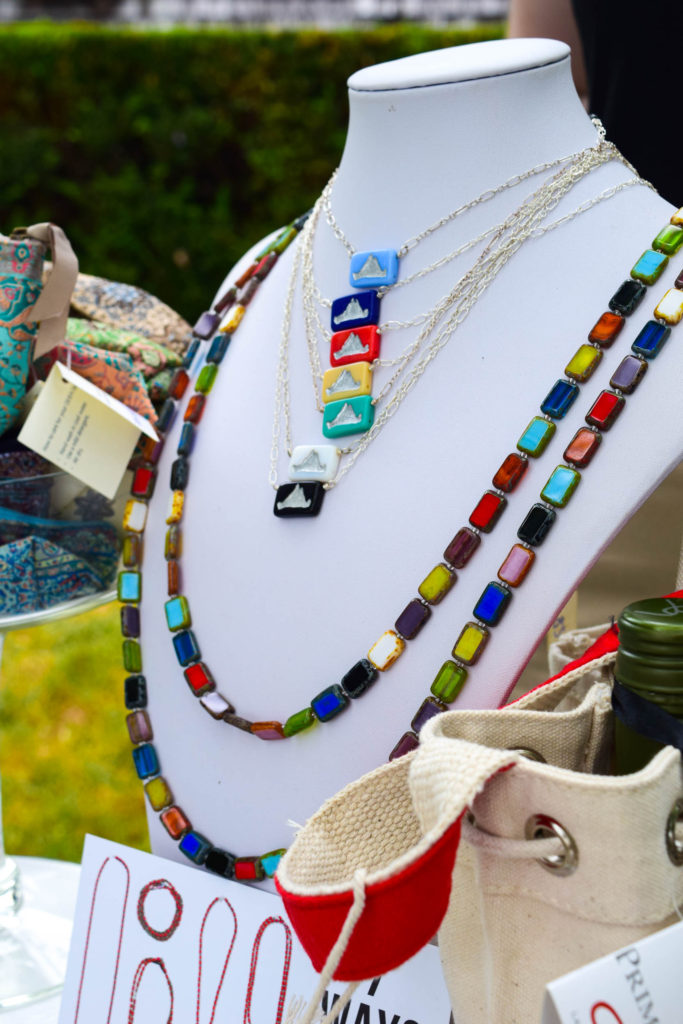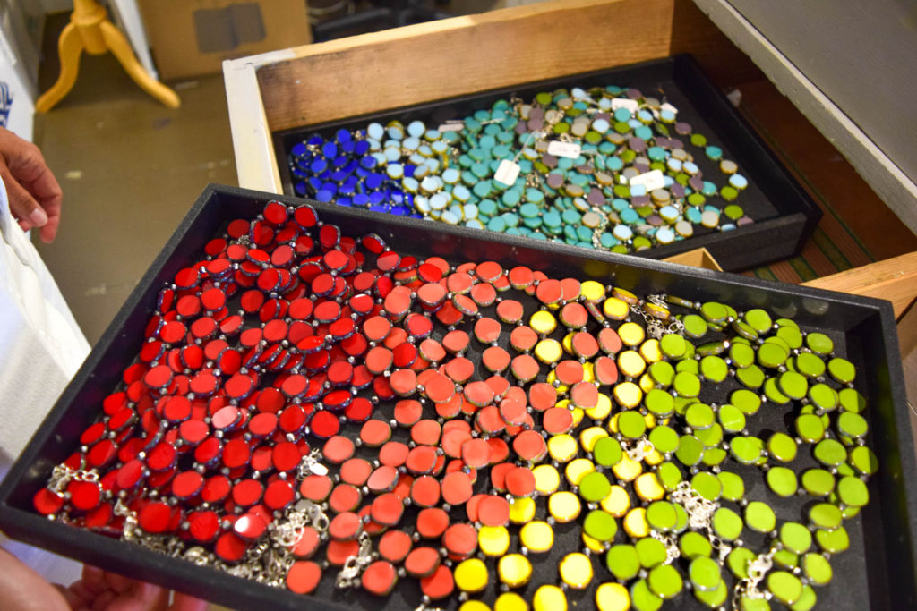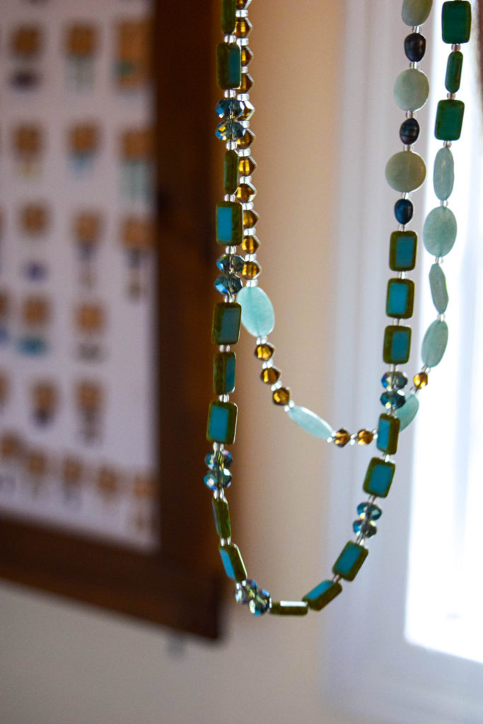 Stefanie pulled out a string of pale blue rectangular glass beads that combined to make a very long necklace and laid it on top of her chest. This was her best-selling piece and its simplicity never wears. What makes it so unique is that you can wear it 7 different ways both as a necklace and as a bracelet. The necklace came in solid colors and multiple colors mixed and matched. She had so many different versions, I couldn't count them all.