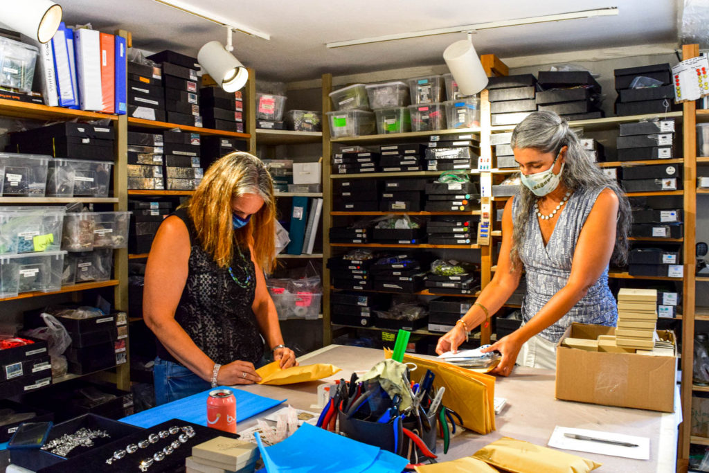 Stefanie runs her fingers through a big black box filled with blue, green, and milky white glass beads. Ever since COVID hit, she's been producing as many new products as she can per month and ramped up her e-commerce. Just this July 2020, she created two new collections. She's gained momentum and interest in her jewelry and locally sold products (specifically the locally sourced fun designed masks) so has been taking as many orders as she can fill.