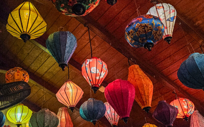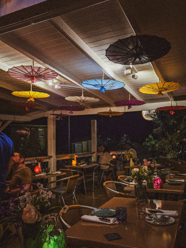The first thing you'll notice is the ceiling: hundreds of colorful Asian lanterns flow from high wooden beams, intertwined with lush hanging greenery. The decor is a whimsical, mix-and-match affair. No two plates, glasses, or cups are the same.