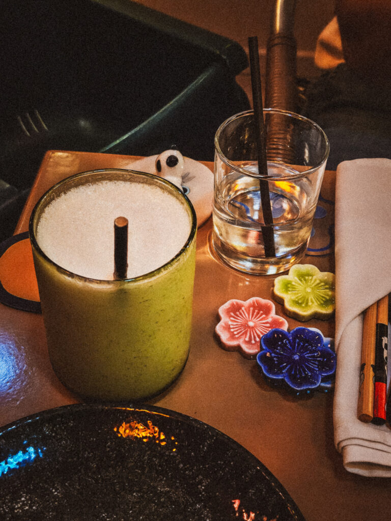 The attention to detail is charmingly playful, our chopsticks were mismatched in the best way (think: one wrapped in flowers, the other in bunnies or Japanese anime). Even the chopstick holders were various designs or fun little shapes, like tiny pandas or cats waiting to hold your utensils. On our table, a soft light wrapped in green paper sat inside a glass bottle, gently fading in and out, while fresh flowers seemed to sprout from every corner.