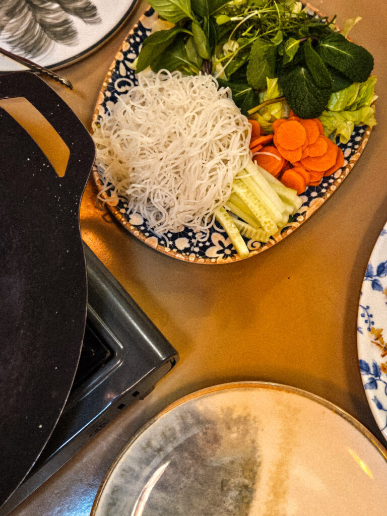For a truly interactive meal, the "Grill for Two" is a must. A large plate of marinated meats (beef, shrimp, and chicken) is presented alongside a bowl of fresh vegetables and vermicelli noodles. They bring a hot plate to your table, and you grill the meats to your liking, filling the air with incredible aromas. You then take rice paper, build your own "spring roll," and dip it into their signature sauces. It was fun, fresh, and flavors were spot on.