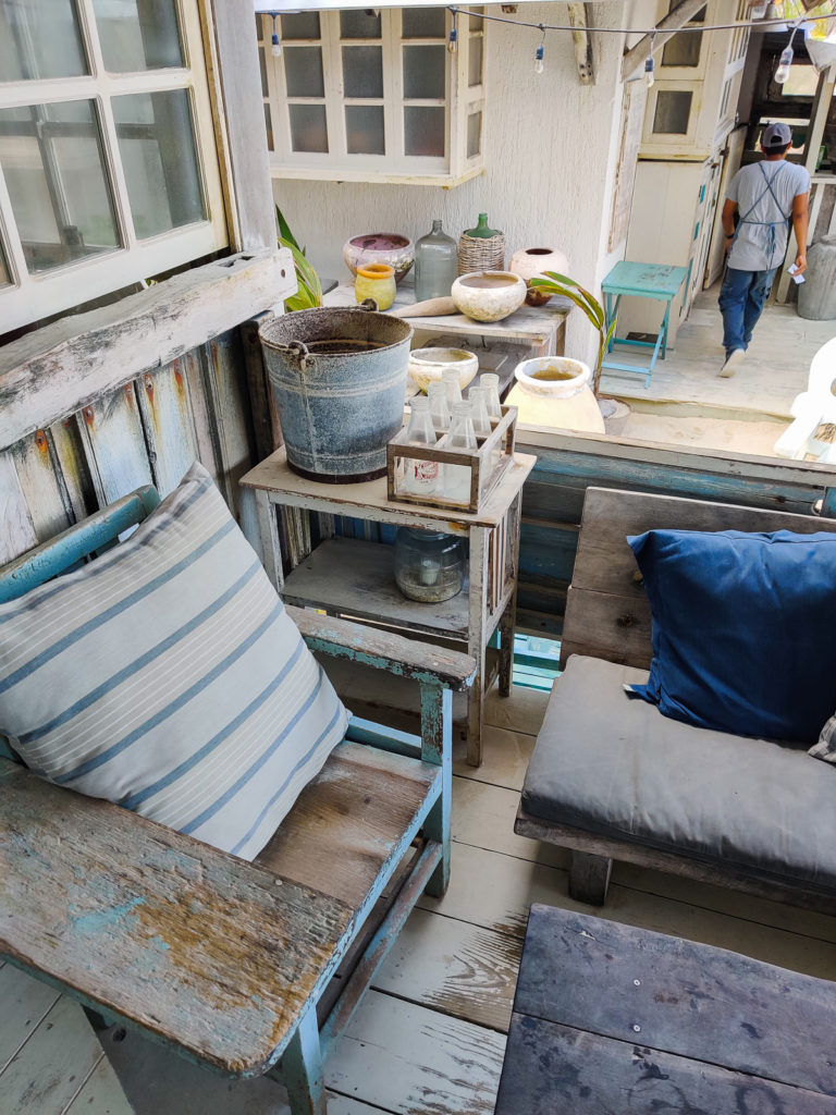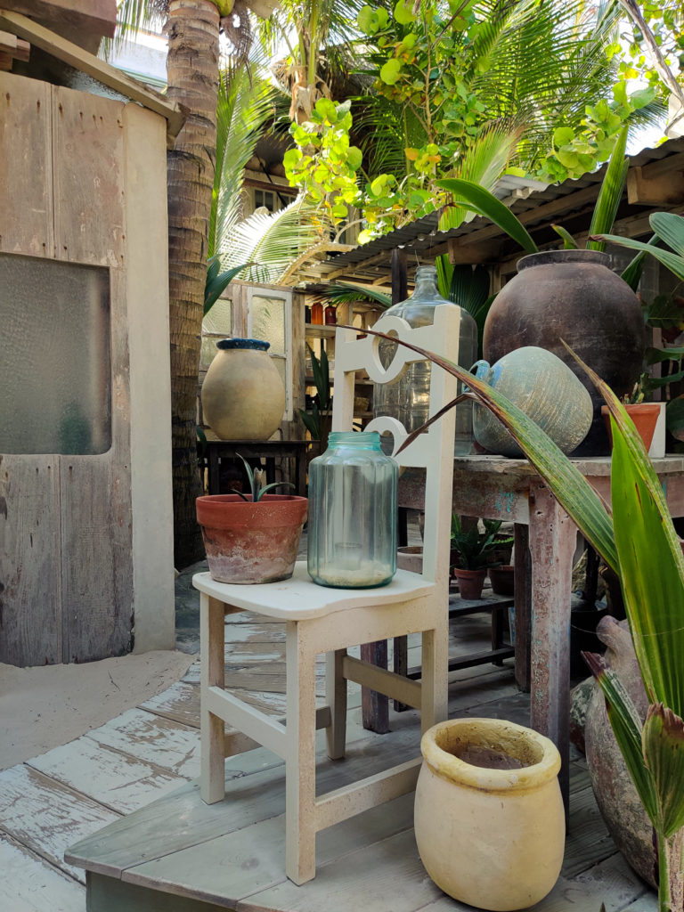 The laid back atmosphere, alla Italiana, adds to it's charm. Getting to the Tulum beach restaurant is an experience in and of itself. You have to whiz in and out of a small alley decorated with Italian terracotta pots, old vintage kitchen ranges, green rooms, plants and quirky details here and there that start to transport you to Italy. The final journey opens up to a white washed wooden restaurant sitting on Tulum Beach. There are multiple places were you can dine. Either on the sand or under the pergola of their wooden structures. We chose the latter.