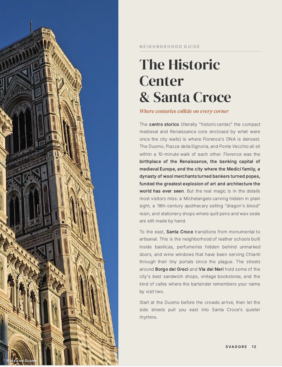 - Neighborhood Deep-Dives: Insider guides to the Centro Storico, Santa Croce, San Marco, Via de’ Tornabuoni, the Oltrarno, Santo Spirito, and San Niccolò.