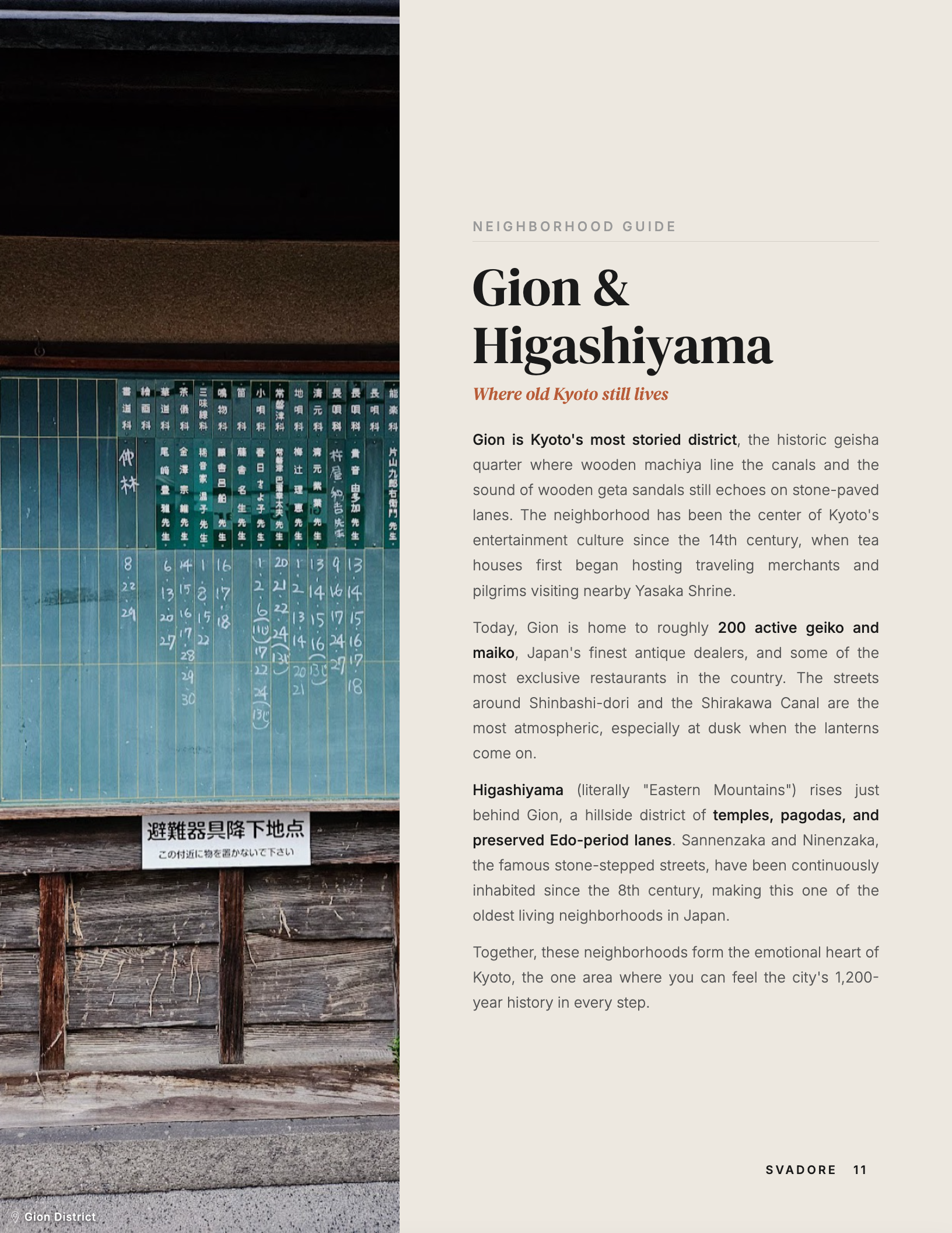 Neighborhood Deep-Dives: Insider guides to Gion, Higashiyama, Teramachi, Arashiyama, Fushimi, and Pontocho.