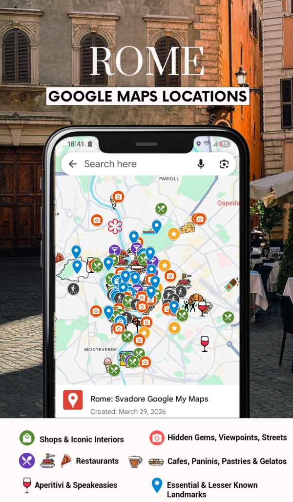 As someone who has spent over 30 years visiting and traveling through Italy, I’m making travel even easier for you by giving you access to my private Rome Google Maps. Have all my Rome tips, recommendations, and unpublished spots inside your Google Maps with a few clicks.