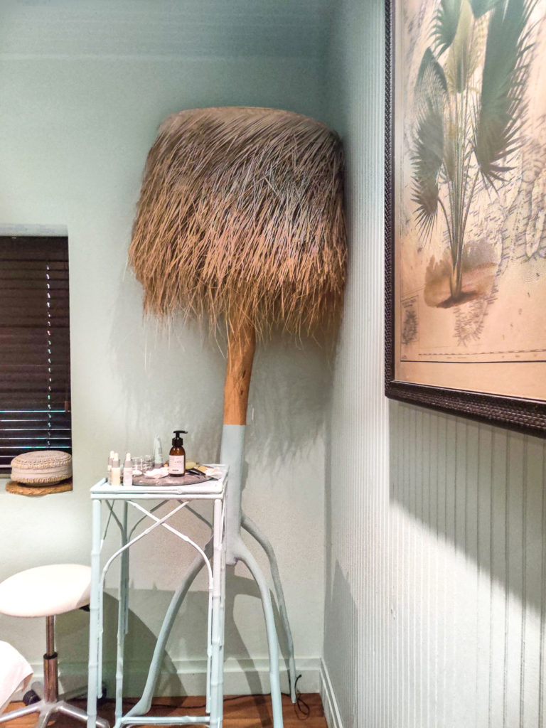 We blow by the small boutique shop set up at the front and head straight for the backroom. We walk down a narrow white hallway with hats, woven baskets, and bags on display and enter a light mint blue colored room. I immediately start to snap pictures and capture content uncontrollably. From the wooden lamp with dry leaf-like frays to the rattan chair. After a few minutes, Marine gently pries the camera away from my fingers. "You won't need that here," she says with a sweet voice as she leads me to the padded table in the center of the room.