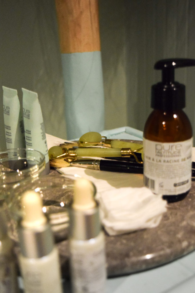 She points to a marble slab sitting on a light mint blue high-top table. She begins to walk me through the process and products we'll be using for my 80 minute Soin Bol D’Air Pur treatment (160 euro value). The total face care treatment, which starts off with a back massage to unwind, involves a manual pressure point massage accompanied by hot Basalt stones and cool jade rollers.