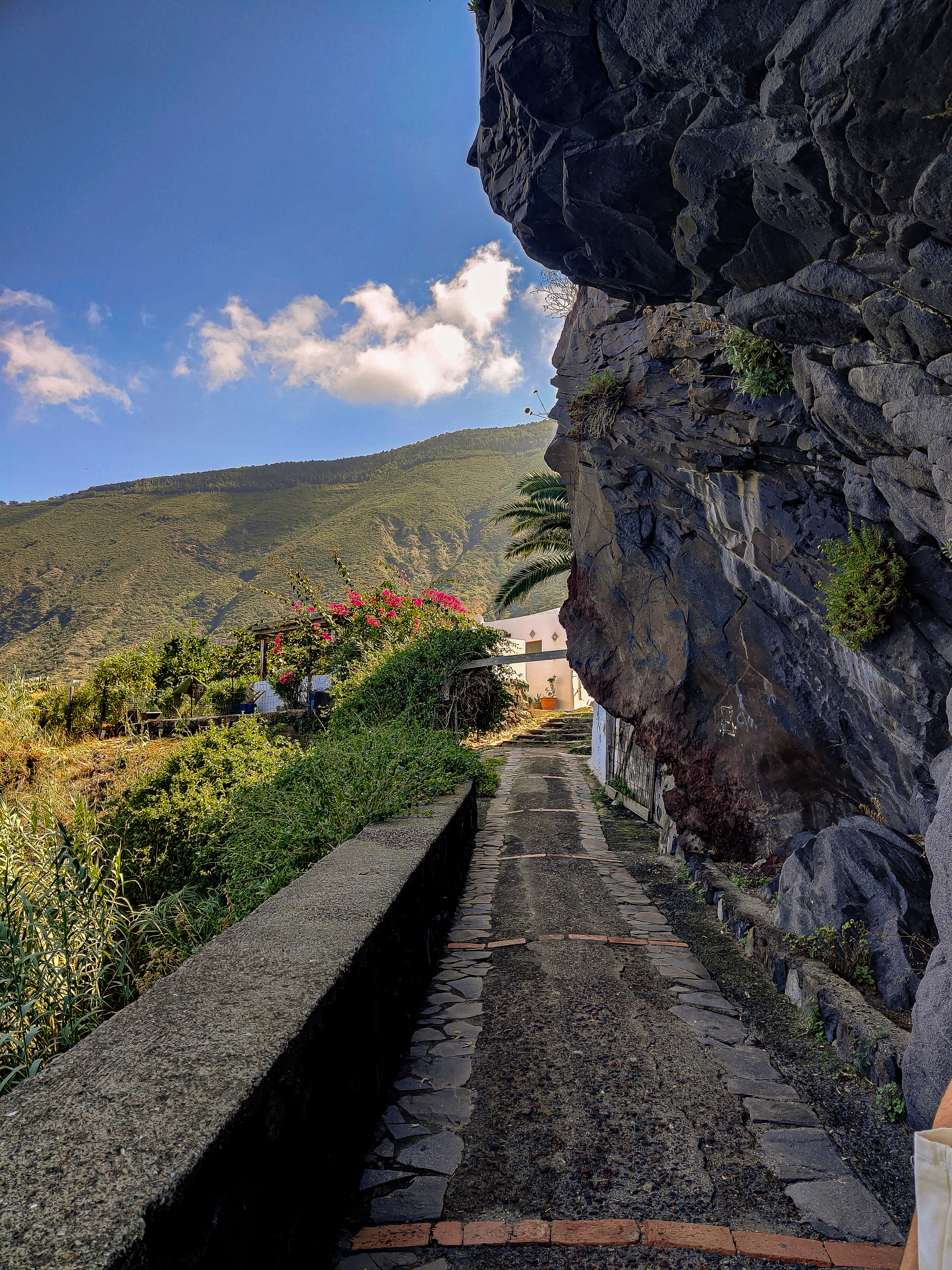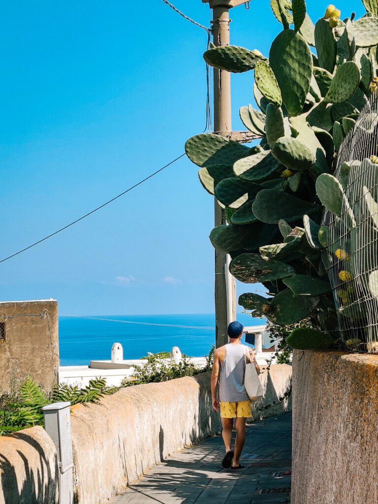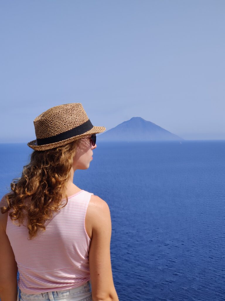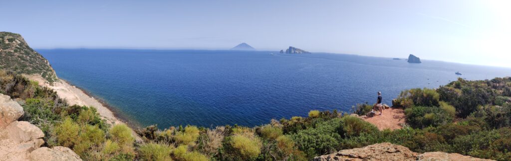 You have 2 options to hike up. Option one, the harder one, is the hiking path. It is a legit hike through fields, bushes, and trees. This one is quite hard and steep. It takes about 2 hours to get up and 1 hour to get down. And watch out for snakes because we did see one big one slither by us on the way back down! Option two on the other hand is easier. You just take the street adjacent to the hiking path and walk all the way up. There is some shade on the hike up, but there's also a good amount of sun. Once at the top, you will take in views of the other volcano Monte dei Porri and the two small Aeolian islands of Alicudi and Filicudi in the distance.