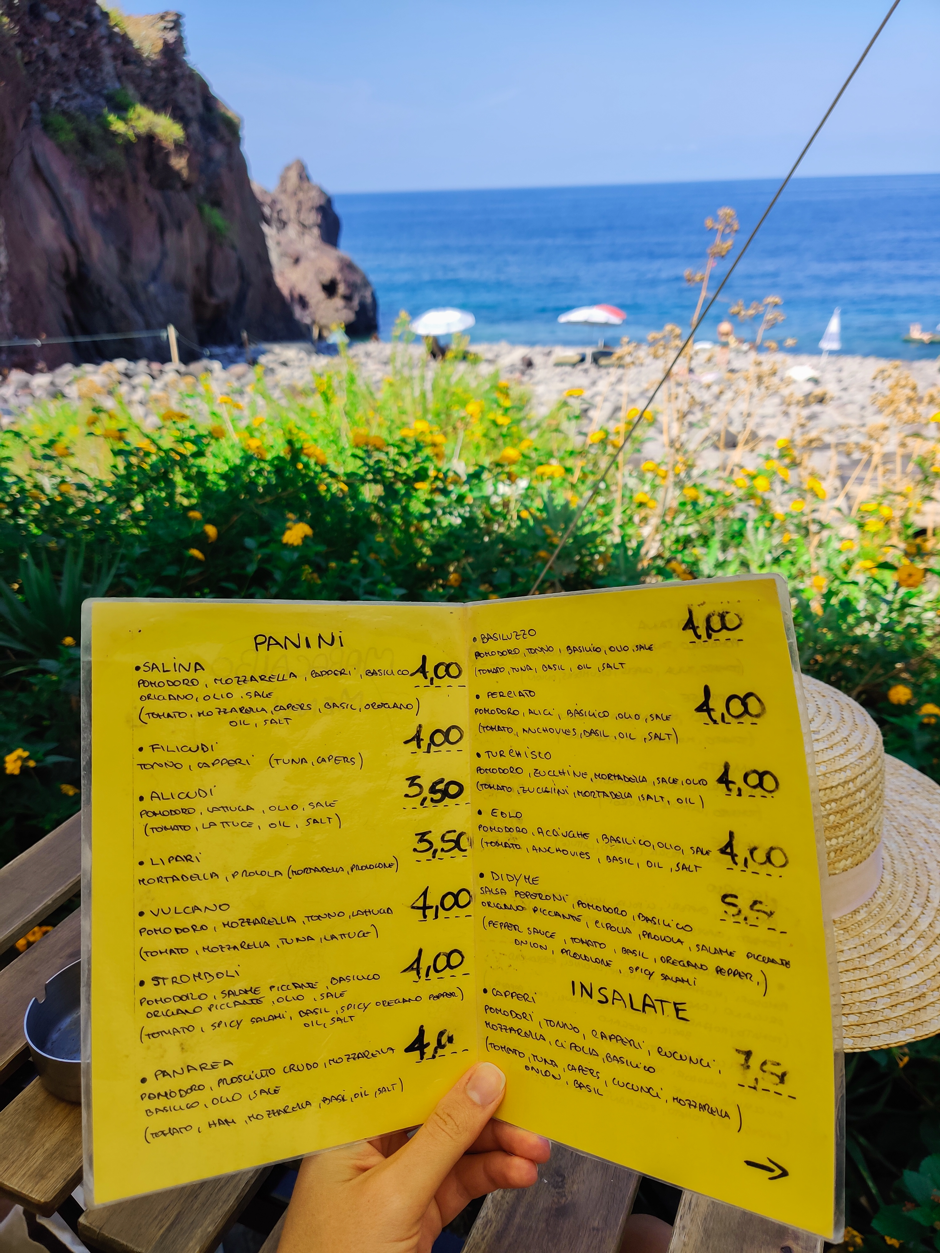 Once at the bottom, you will find a beach bar called Bar Maracaibo tucked away in the back of the pebble beach. The place only accepts walk ins. Prices are very affordable starting at 4 euro for a sandwich and 7 euro for a salad. They also serve great granitàs and cocktails. Pat and I got a table with a view. I ordered a simple Aeolian tuna salad, with the island specialty of course—capers. Pat ordered a Vulcano panino. Both very good and satisfying, especially for the price.