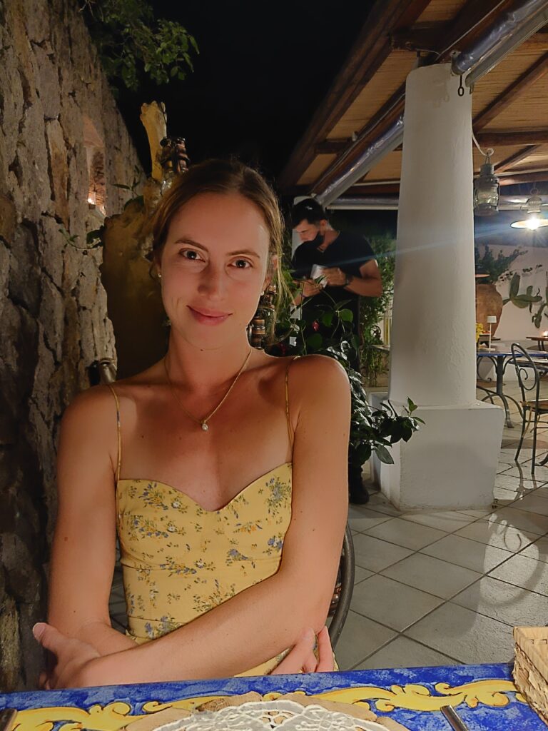 After quickly showering back at the hotel, we hopped back onto our electric vespa and made our way back to Pollara in time for sunset at La Locanda del Postino hotel and restaurant. In the summer months, dinner is served on a panoramic terrace overlooking the sea and surrounded by the crater of Pollara. After the sunset, lanterns are placed on the tables to create a romantic and suggestive atmosphere. The low lighting allows you to admire the beautiful starry sky of Pollara. The focus here is typical Aeolian dishes and fresh fish utilizing herbs from their garden.