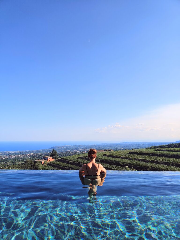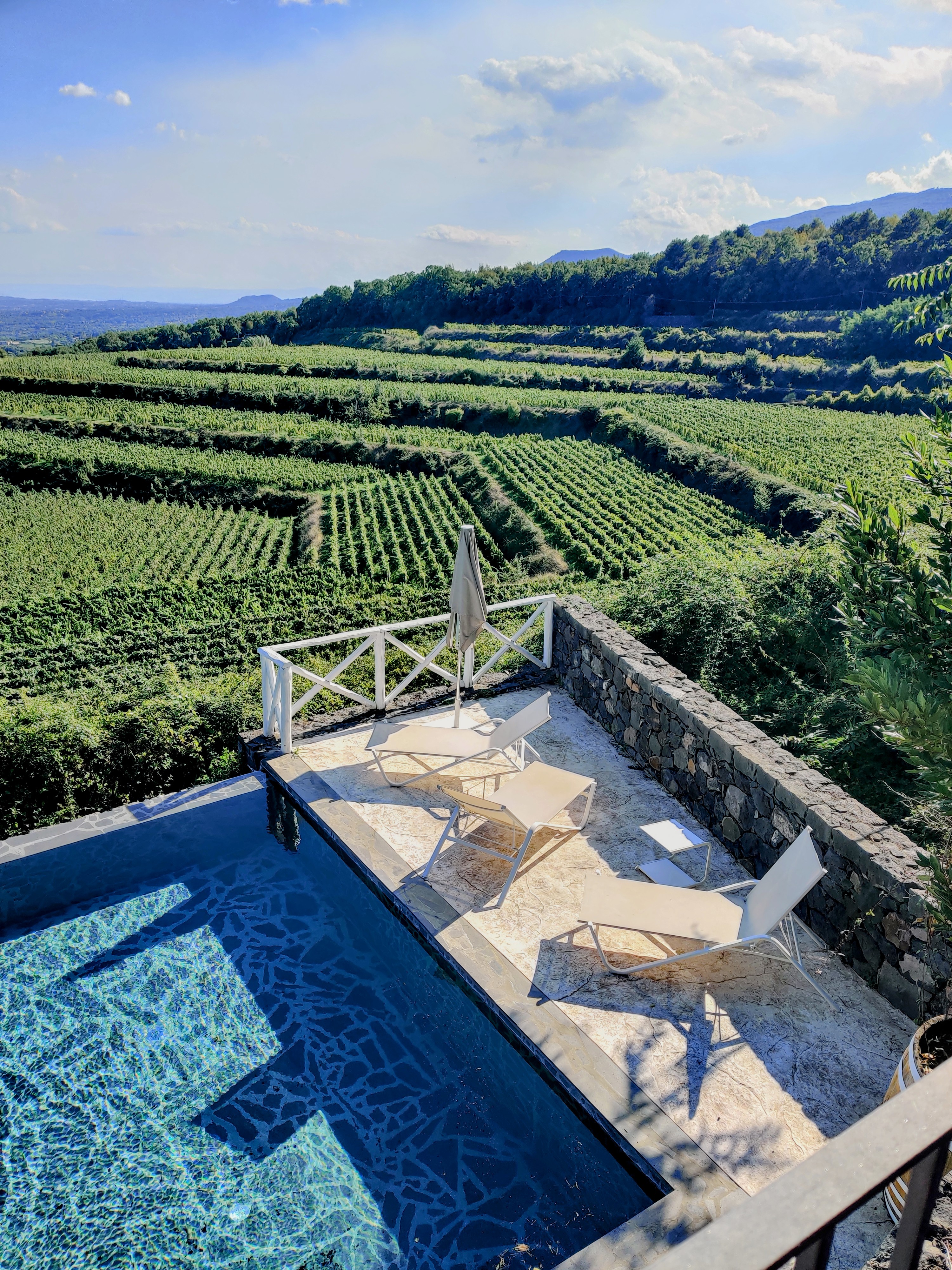 We pull up to one of my favorite wine resorts on the slopes of Mt. Etna—a place I’ve actually returned to, which says a lot. With just four rooms tucked into a quiet Sicilian town, it’s the kind of spot where time slows and silence feels golden. The estate stretches across volcanic soil, and from the infinity pool, the vineyards tumble down toward the Ionian Sea like waves of green lava.