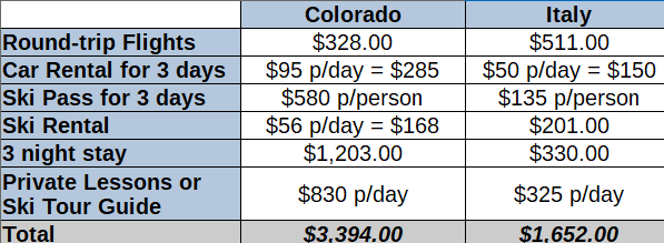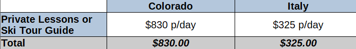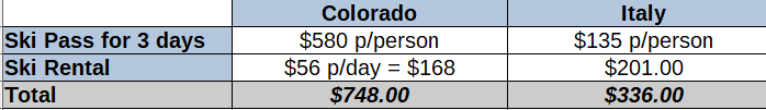 In summary, I think the numbers below speak for themselves. Skiing in Europe is more affordable than skiing in America by approximately $2,000...and this doesn't include food!! With all that extra money you're saving, I highly encourage you book a ski trip to the Alps with Ski Itineraries. The cost for Ski Itineraries Discovery Package was included in my cost analysis from my trip to Italy below ($325 p/day). Spare yourself the hassle of trying to figure out what ski passes to buy, where to get ski rentals, speaking the language, having to deal with transportation, and finding the best hotel location. Let Ski Itineraries do it all for you. After all, if you're skiing in Europe you might as well do it well with an unforgettable white glove skiing experience.