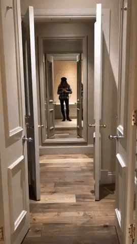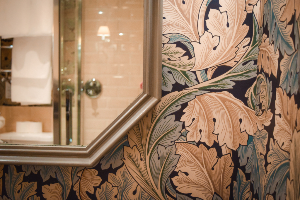 As soon as I hung my clothes in the spacious walk-in closet of our bedroom, I wandered around the room dying with the curiosity to see all of it. French doors opened up to a vanity and walk-in closet, followed by another set of French doors that opened up to the bathroom with a separate rainfall shower and bath tub. Pink and blue pastel wallpaper with vine patterns decor the wall.