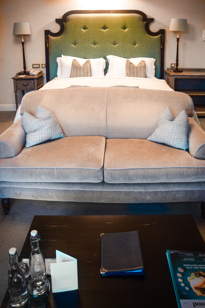 We stayed in a Luxury Room in the main house. I walked towards our main table in our private sitting area. A small sofa couch faced the river with our own private fireplace. Behind the sofa was our king sized bed with white crisp linens, a pillow top mattress, and accent pillows. There was a welcome note on the table in our sitting area accompanied by complimentary bottled water and some welcome delicious welcome sweets. A perfect pick-me-up before we explored the castle.