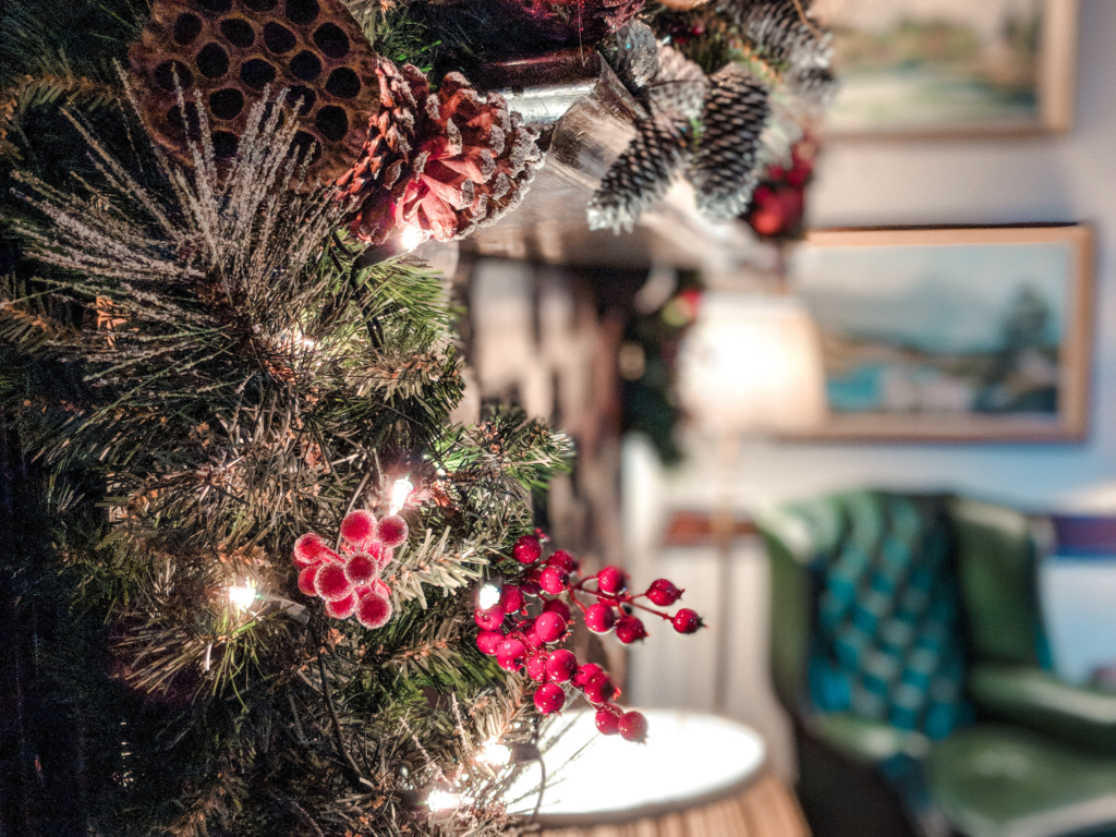 The reception sitting area Christmas decor abound!