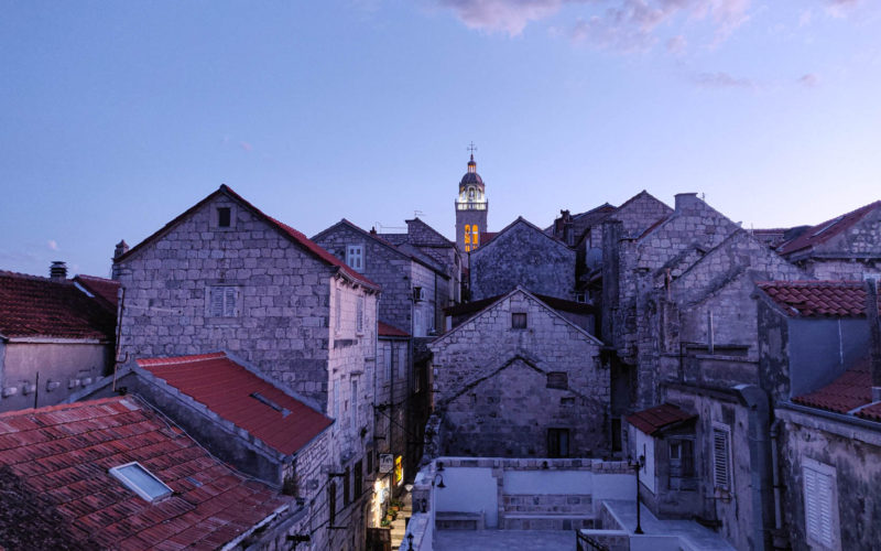 When we finally made it out of the bay and out to sea, we found ourselves in the middle of the channel between mainland Croatia, specifically Peljesac Peninsula, and Korcula. This sweet spot is known to have one of the most beautiful sunsets in Croatia. The sun sets between the mountainous island of Korcula and the peninsula casting a unique color and shadow on the water, sky, and mountains. After watching the sunset for a few minutes we continued to the town of Korcula old town. During the trip our water taxi driver gave us the history of the town and shared local stories and anecdotes of things we should pay attention to when wandering the streets. We were dropped off at the main port and were on our way into the walled city.
