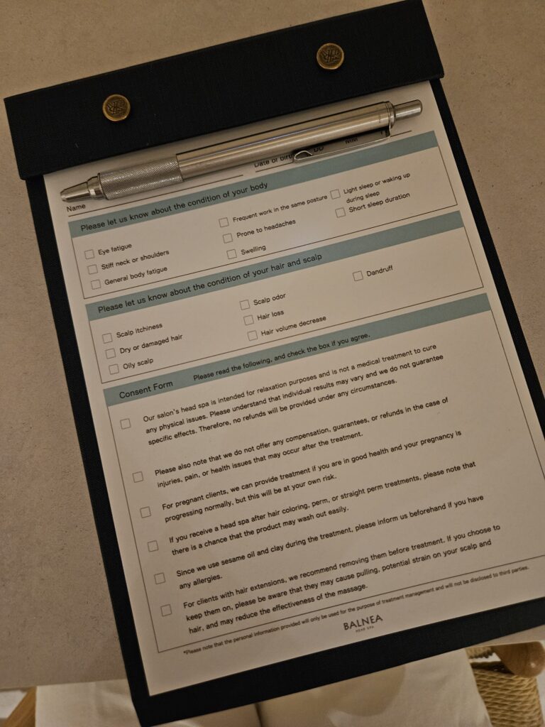The experience starts with a short intake form. They asked about my stress levels, sleep quality, and hair issues — so the treatment can be customized to me.