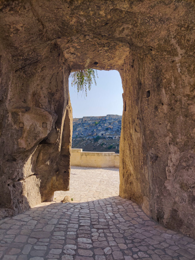 The first stop in the Sassi Caveoso area is Santa Maria de Idris, a big rock jutting out from the earth with a cross and church at the top. You may recognize the rock from the movie The Passion of the Christ. Santa Maria de Idris is home to the oldest crypt, dedicated to San Giovanni in Monterrone, that contains frescoes as far back as the 12th century. If you wish to visit the inside of this cave church, pay a small fee and go for it! If not, continue down Via Madonna dell'Idris as pictured above towards Vico Solitario.