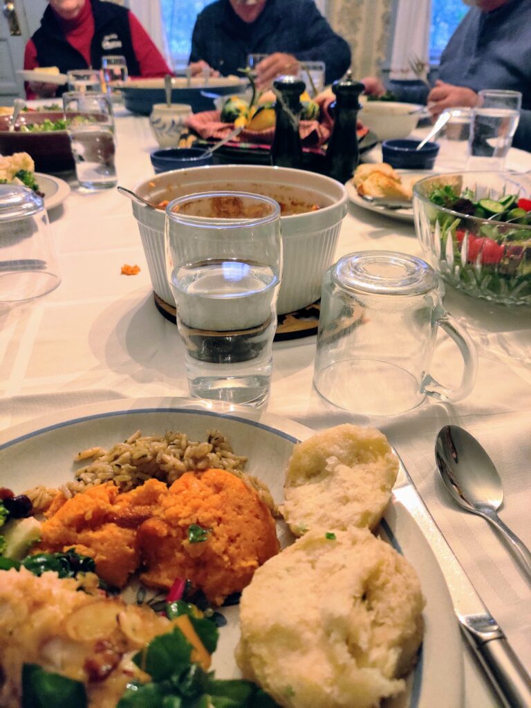 Meal: Ham, carrots with maple syrup and cranberries, beans, kombucha squash (a Japanese squash), carrot cake 🍰, and pumpkin biscuits.