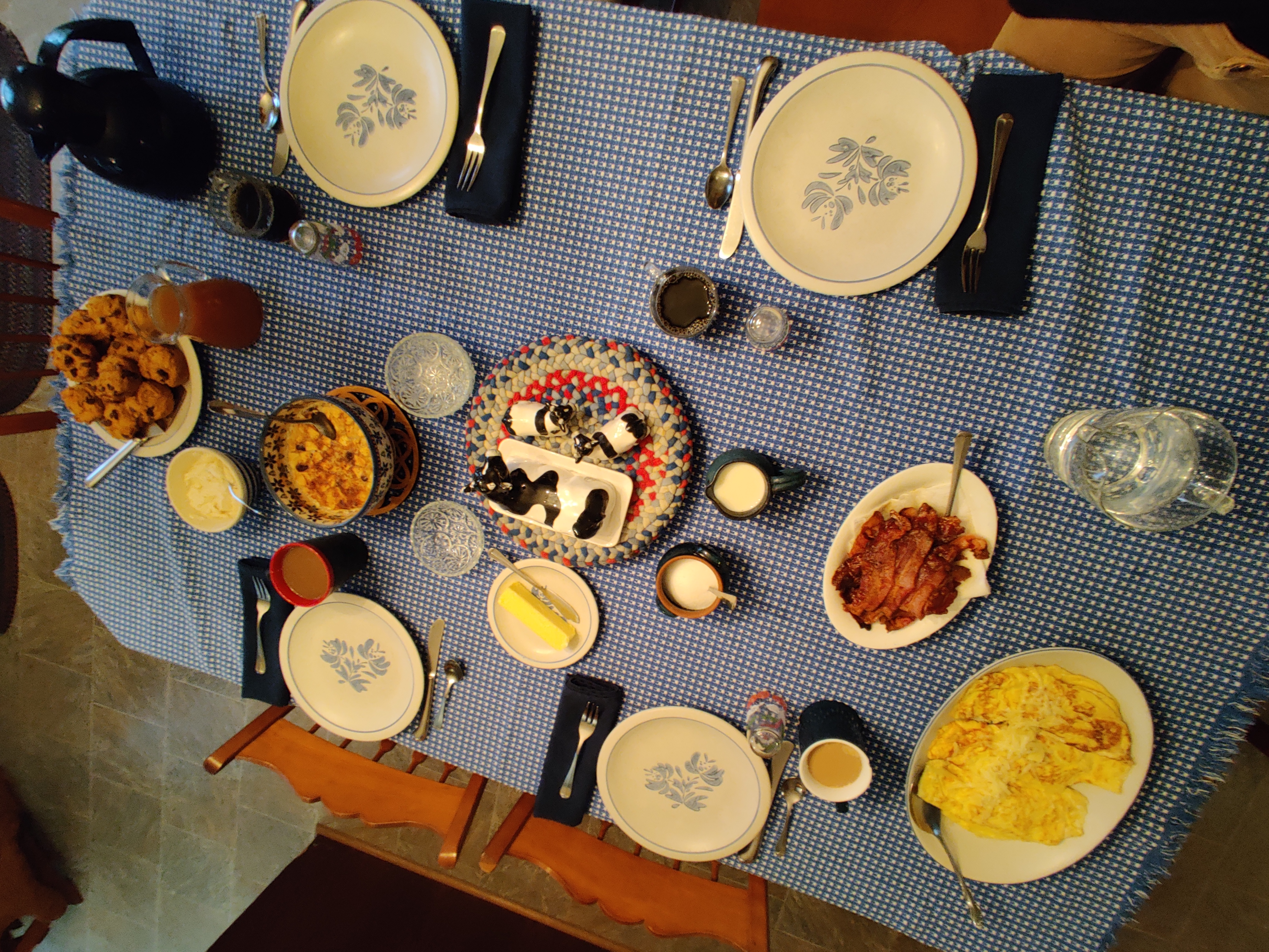 Breakfast starts at 8AM on the dot. That's an early start for Patrick and I, especially when on vacation. But for the farmers, it's a late start since they've been up all morning getting the job done. The morning was family affair, in addition to guests, some of Beth and Bob's family joined us for breakfast. Beth and Bob's son David, popped into say hello in between jobs, but his wife Asia (pronounced Asha) and their son Henry spent the morning with us.