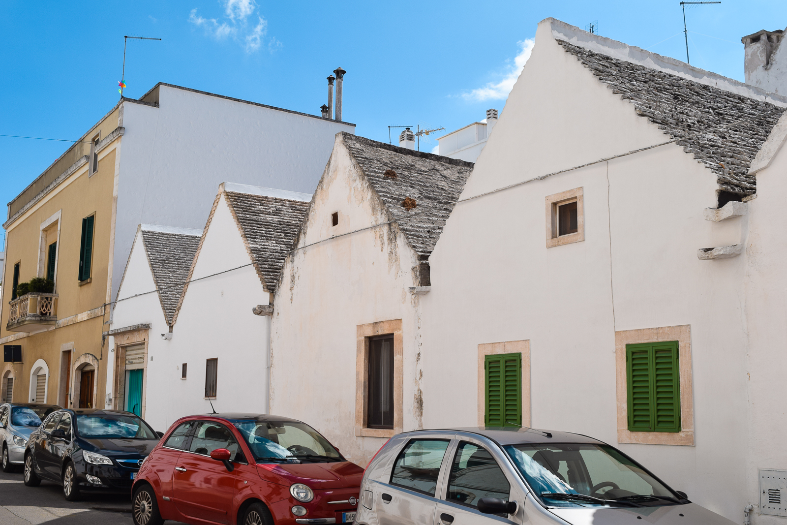 Like much of Puglia, Locorotondo is rich in blindingly white limestone houses and narrow alleyways bedecked in geraniums and citrus plants wound in true Italian style around squares and tiny palm-sheltered courtyards. The limestone paint used in the buildings was said to have warded the plague back in the 1690s, similar to the town of Ostuni. By the time my mother had parked the cark and we'd wandered into the first piazza, I was smitten. Different from Alberobello and Ostuni, the roofs here recall a mix between the two villages. The structures are tall and braced with arched passages with black limestone roofs pitched similar to a trullo. The shapes of the roofs are iconic. They recall what a child might draw when asked to draw a house, a triangle top and square base.