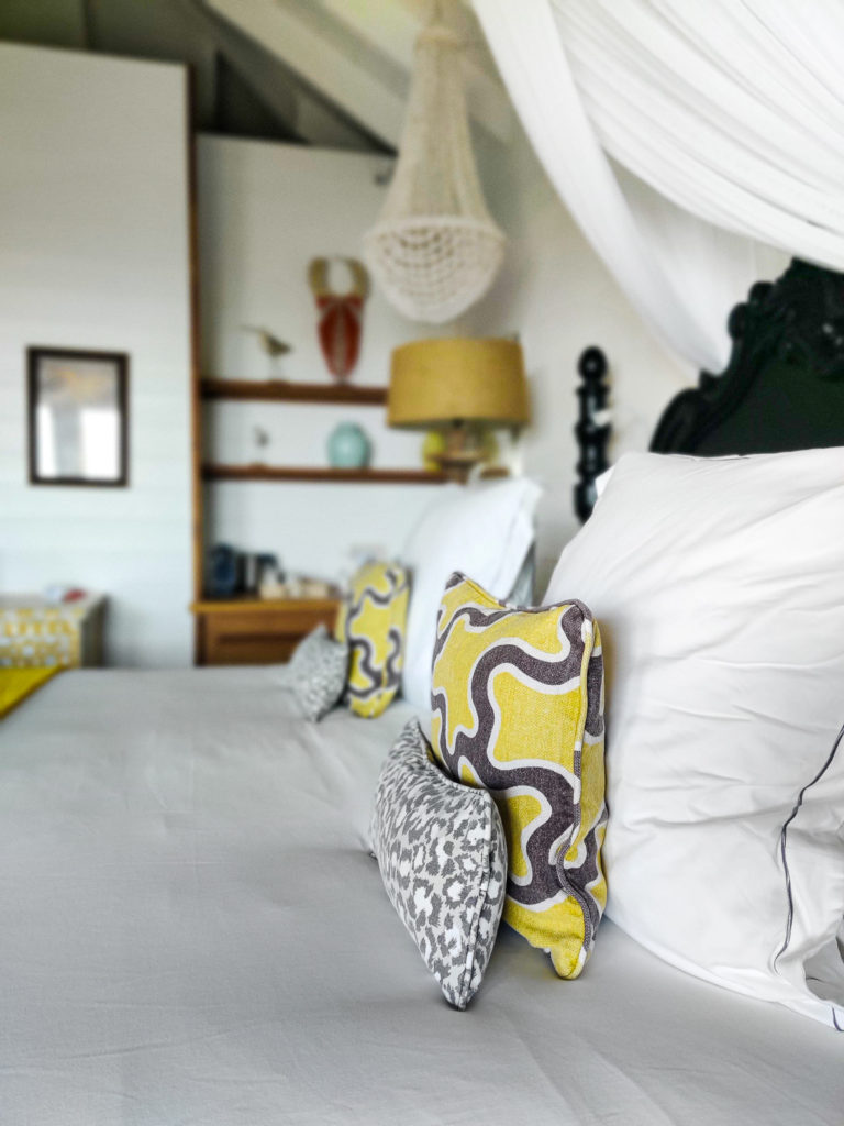 Each cottage has a different theme. Ours was the Pelican room themed yellow. The décor was outstanding and of course all done by Marie herself with her exquisite taste. To allow you to sleep with the sliding doors open, they wrap your bed with an elegant bug net to make you feel like your a young princess once again. Apparently, the bug net was a first time for Patrick--I couldn't believe it. I had one when I was a kid growing up. The bug net isn't actually necessary because of mosquitoes, but because it's an open aired room so you'll occasionally find small bugs in the room. But for being a hotel in the middle of the wilderness, you rarely come across bugs. They even give you a bug zapper! But you won't need it.