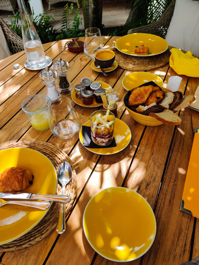 As a guest of the property, we were guaranteed a table for breakfast as part of our stay. If you’re not a guest, a reservation for breakfast or brunch in St. Barth, particularly on Saturdays and Sundays is in order. Families, friends, locals, and vacationers book their breakfast and brunches at Gyp Sea St. Barth within a heartbeat. Breakfast is served under a canopy of foliage at Gyp Sea Hotel. Nearby is a pair of giant palm fronds and banana tree leaves with broad drooping leaves of yellow and green. The pool is just a couple of feet away glistening in the sun.